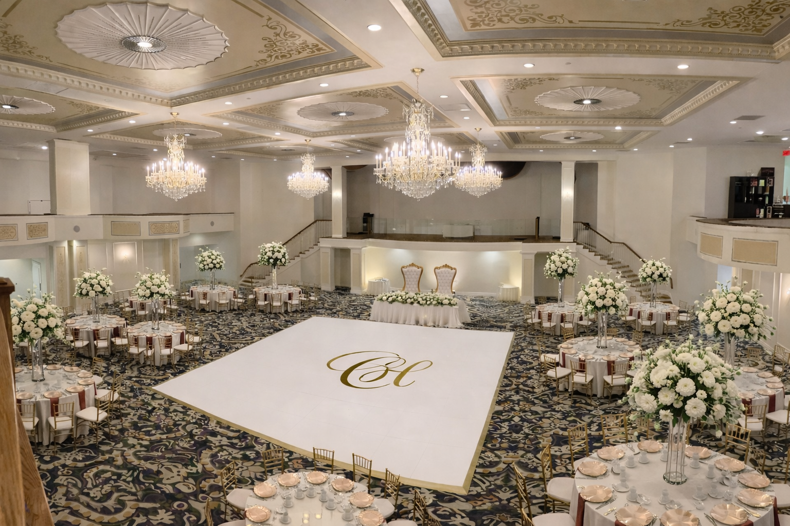 The Mezzanine Balcony offers a dramatic setting for your entertainment and introduction to get the party started from on high. What is one of the memorable and picture-perfect reasons to even have a balcony? For the bride to make her famous bouquet toss of course. We guarantee it will be a moment you won’t dare forget. *Dance Floor Wrap Not Included
